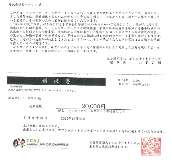 【CSR情報】2025年度アフラック・ペアレンツハウス様への寄付をしました。